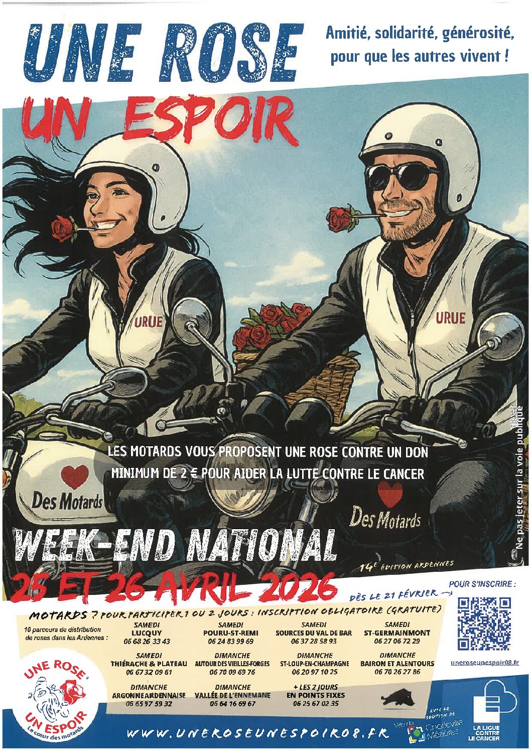 Week-End national les 25 et 26avril Comme les années précédentes, les motards sillonneront les rues de Les Ayvelles pour vous proposer une rose contre un don minimum de 2 € ...